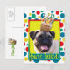 Invite your guests with this whimsical Pug Dog Greeting Card. With a cupcake balanced on it's head, this design is sure to bring a smile and giggles! BTW, This design has several versions, with different background colours. There is also a Happy Birthday version.