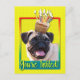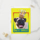Invite your guests with this whimsical Pug Dog Greeting Card. With a cupcake balanced on it's head, this design is sure to bring a smile and giggles! BTW, This design has several versions, with different background colours. There is also a Happy Birthday version.