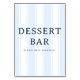 This wedding tabletop sign features a clean, minimalist design with vertical stripes in soft shades of blue, creating a calming and inviting atmosphere. The bold serif font for "DESSERT BAR" is complemented by a friendly sans-serif message below, encouraging guests to indulge freely. The simple layout emphasises clarity and elegance, making it perfect for guiding guests to the sweet treats at your event. Its modern style and soothing colour palette add a touch of sophistication while maintaining a casual vibe ideal for any dessert station.