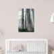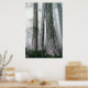 Fog descends into a forest. Three trees are grouped together among some ferns.