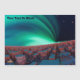 An aurora, green due to ionised oxygen, appears low on the horizon, a city sits in the foreground. Add your own text.