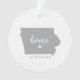 A simple ornament with an outline of the state of Iowa and beautiful lettering for the word "home" placed in the centre. Personalise this ornament by inserting your hometown & customise further by placing the ♥ near your hometown on the Iowa state image. These are great gifts, keepsakes, and perfect for collections!