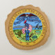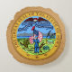 The Great Seal of the State of Iowa was created in 1847 and depicts a citizen soldier standing in a wheat field surrounded by symbols important in early historical Iowa, including farming, mining, and transportation with the Mississippi River in the background. An eagle overhead bears the state motto.