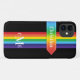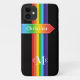 This personalised Case-Mate custom iPhone 11 case has a rainbow-coloured vertical stripes pattern down the centre with a rainbow coloured banner ribbon running horizontally below the camera that has white stitching and white lettering that you can customise with your name or other text. There is also a 3-letter monogram centred at the bottom. The black background can be changed to be any colour you want. You'll be proud to show off this modern and trendy new case that makes a chic statement! If you need assistance, email niteowlstudio@gmail.com.