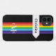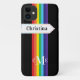 This personalised Case-Mate custom iPhone 11 case has a rainbow-coloured vertical stripes pattern down the centre with a white banner ribbon running horizontally below the camera that has rainbow coloured stitching and black lettering that you can customise with your name or other text. There is also a 3-letter monogram centred at the bottom. The black background can be changed to be any colour you want. You'll be proud to show off this modern and trendy new case that makes a chic statement! If you need assistance, email niteowlstudio@gmail.com.