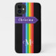 This personalised Case-Mate custom iPhone 11 case has a rainbow-coloured vertical stripes pattern down the centre with a violet purple banner ribbon running horizontally below the camera that has white stitching and white lettering that you can customise with your name or other text. There is also a 3-letter monogram centred at the bottom. The black background can be changed to be any colour you want. You'll be proud to show off this modern and trendy new case that makes a chic statement! If you need assistance, email niteowlstudio@gmail.com.