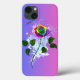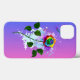 Energise your iPhone 13 with this vibrant and artistic case! A stunning rainbow-coloured hummingbird gracefully hovers near a beautifully detailed rainbow rose, all set against a captivating gradient backdrop of blue and pink with dynamic white paint splatters.