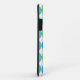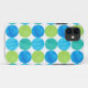 A vibrantly coloured case to protect your iPhone 5, with a 'Blue Moons' abstract pattern in bright blues and neon green on a white background; from a handpainted paper collage design by Judy Adamson.