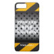 This black and yellow striped grunge pattern Proceed with Caution Case-Mate Barely There iPhone 7 Case has a FAUX silver grey grill on the centre with template text for you to add your company name, monogram, initials, name or other text. It makes a statement that tells people to keep away from your device! Get lots of compliments from friends, family, and customers with this unique custom case. If you need assistance, email niteowlstudio@gmail.com.