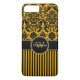 This personalised golden yellow and black Case-Mate custom iPhone 7 case has a damask and striped background pattern with a black and white band and circle to add your name, initials, monogram or other text to. This modern and trendy new case makes a chic statement for the hip young fashionista! If you need assistance, email niteowlstudio@gmail.com.