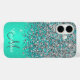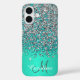 Blue teal and silver PRINTED glitter, personalised with your name and monogram. Faux green brushed metal steel. Mobile iPhone 16 phone case.