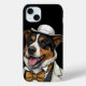 Fun Australian shepherd dog in three-piece costume and bowler hat.