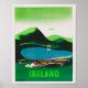 This Ireland Vintage Poster features a stunning image of a scenic countryside view towards a castle on the other side of a lake reflected in the calm water in front of rolling hills on the horizon with fields, trees, and farmhouses surrounded by stone walls in the foreground.