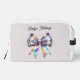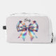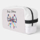 This makeup toiletry bag features a charming iridescent bow personalised with a name. Envision the light dancing off the wonderful colours of the bow, all set against a powder pink background, making it a functional yet stylish accessory. The bow and personalisation is also on the backside of this bag.