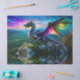 Beautiful and colourful Iridescent Dragon with wings wide spread stands on a mountain