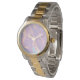 An elegant wrist watch featuring an ethereal face reflecting subtle iridescent colours.
