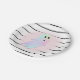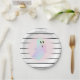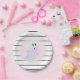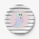 A not so spooky halloween party! Pastel pink Hey Boo Iridescent Ghost Halloween Birthday Party Plates with black and white stripe background.