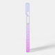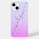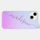 Iridescent Girly Pink Shimmer Personalised Name iPhone 14 Smart Phone Case features a modern pink and blue iridescent shimmer pattern with your personalised name in purple hand written calligraphy script typography. Designed by ©Evco Studio www.zazzle.com/store/evcostudio