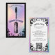 Elevate your lash studio or lash artist brand with our Iridescent Holographic Vintage Lash Studio Business Card, featuring a hand-drawn ornate scroll frame set against a faux iridescent holographic background for a striking, tarot-inspired look. The front showcases a vintage mascara wand centered within the scroll design, leaving space for your studio name and tagline, while the reverse displays elegant flourishes, an iridescent holographic frame, and your contact information with a QR code for easy bookings. The dramatic blend of black paired with shimmering holographic accents creates a sophisticated, mystical aesthetic, perfect for lash studios, lash artists, and beauty professionals seeking a unique, vintage-inspired presentation. Design and illustration created by ©Moodthology Papery.
