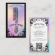 Elevate your hair salon or stylist brand with our Iridescent holographic vintage hair salon business card, featuring a hand-drawn ornate scroll frame set against a faux iridescent holographic background for a striking, tarot-inspired look. The front showcases a vintage comb centered within the scroll design, leaving space for your company name and tagline, while the reverse displays elegant flourishes, an iridescent holographic frame, and your contact information with a QR code for easy bookings. The dramatic blend of black and paired with shimmering holographic accents creates a sophisticated gothic aesthetic, perfect for hair salons, hair stylists, barber shops, and beauty professionals seeking a unique, mystical, and vintage-inspired presentation. Design and illustration created by ©Moodthology Papery.