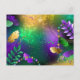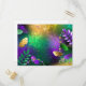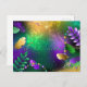 Textural iridescent mardi gras background with spots of purple, yellow and green, decorated with fluffy feathers and shiny beads. Mardi gras holiday.