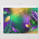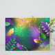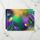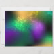 Textural iridescent mardi gras background with spots of purple, yellow and green, decorated with fluffy feathers and shiny beads. Mardi gras holiday.