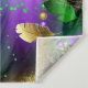 Textural iridescent mardi gras background with spots of purple, yellow and green, decorated with fluffy feathers and shiny beads. Mardi gras holiday.