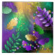 Textural iridescent mardi gras background with spots of purple, yellow and green, decorated with fluffy feathers and shiny beads. Mardi gras holiday.