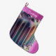 Picture a delightful Christmas stocking featuring an iridescent rainbow design dripping with elegance. The stocking is finished with a border that mimics sparkling glitter in a rich hot pink, providing a lovely contrast. On the topper and the toe of the stocking ready to be personalised with a name.