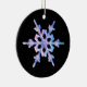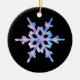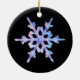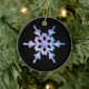 Icy, iridescent, pink, blue & white snowflake, vivid against a black background
