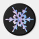 Icy, iridescent, pink, blue & white snowflake, vivid against a black background