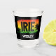 Tropical palm trees rum shot glass, with IRIE text over a rasta flag coloured sunset. There's customisable text underneath where you can add your own name or message