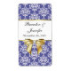 Elegant wedding mini wine labels ready for you to personalise with your own information. Trendy iris blue and white damask pattern, on the top and bottom of the label, with a white text area, in the centre, edged on either side with a gold tone line, and a gold tone bow, on the bottom, of the text area. Text is fully customisable to suit your wedding needs. Great for your wedding reception table or gift wines.