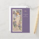 A postcard with the vintage illustration by Alphonse Mucha from The Flower Series, Iris (1898), which has been digitally restored and enhanced. A portrait of a woman in an evening gown surrounded by lavender iris blooms.