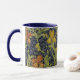 This design features a print of a fabric design created by the British artist William Morris (1834–1896), who is associated with the Arts and Crafts Movement. It depicts blue and orange iris flowers in an elegantly symmetrical pattern. The flower is named after Iris, who was the Greek goddess of the rainbow and a messenger for the Olympian gods, carrying messages down to humanity. The leaves and stems of the iris plants are depicted in blue and green. There are a few yellow birds perching on some of the plants' foliage. The original pattern was designed by William Morris in 1887.