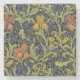 This design features a print of a fabric design created by the British artist William Morris (1834–1896), who is associated with the Arts and Crafts Movement. It depicts blue and orange iris flowers in an elegantly symmetrical pattern. The flower is named after Iris, who was the Greek goddess of the rainbow and a messenger for the Olympian gods, carrying messages down to humanity. The leaves and stems of the iris plants are depicted in blue and green. There are a few yellow birds perching on some of the plants' foliage. The original pattern was designed by William Morris in 1887.