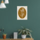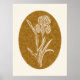 Poster in a modern, minimalist, boho style print of a single iris flower and leaves in silhouette on a tortoiseshell brown textured background