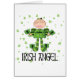 This cute St. Patrick's Day design features a little girl dressed in green with green wings and the caption "Irish Angel" on a background of shamrocks.