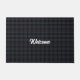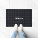 Stylish front doormat featuring an Irish County Carlow tartan plaid pattern. Customisable greeting in modern white script font.