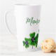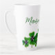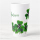 Latte mug with four-leaf clovers and place for a name. White mug has a bottom border of green clovers with dark centres. Text for the name is green in a handwritten script font. The name will show on the front for a right-handed person. Also comes in a shorter mug.