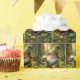 A jolly gnome in a green hat and jacket sits cheerfully on a tree stump, clutching a mug of frothy green beer amidst lush clover and dappled sunlight, radiating whimsical charm