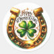 Golden horseshoe-shaped emblem, centrally decorated with a vibrant green four-leaf clover. The words "HAPPY ST. PATRICK'S DAY" are inscribed around the horseshoe in a distinctive, hand-drawn, script-style typeface emphasising the holiday.