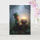A joyful Irish leprechaun perched on a tree stump, surrounded by a magical, misty forest, proudly guarding a radiant pot filled with shimmering gold coins.