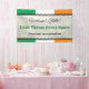 Welcome banner for any Irish or Ireland theme event has a background of the flag of Ireland in green, white, and orange. The centre is a faded vintage image of the countryside in Antrim. with a classic knot border. Use for any Irish celebration, festival, or theme party. All text can be edited.