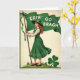 This card features a vintage-style illustration of a poised red-haired woman in an emerald green pinafore dress and a matching wide-brim hat with a striped ribbon, set against a warm cream background. Her curls fall over one shoulder, and the soft smile on her face feels like a friendly invitation to step closer. She lifts a flowing green flag that stretches behind her in the breeze, and the white text “ERIN GO BRAGH” sits centered across the fabric in large, easy-to-read letters 💚. A small green-and-white ribbon is tied near the top of the flagpole, adding a gentle, thoughtful touch. Along the hem of her skirt, small white shamrock motifs repeat in a neat border, echoing the St. Patrick’s Day theme ☘️. Below, she stands on a grassy mound sprinkled with tiny shamrocks that lead your eye toward the foreground. In the lower right corner, a large three-leaf clover is drawn with strong outlines and deep green shading.