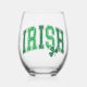 Show your Irish pride with this fun stemless wine glass that features the word "IRISH" in a curved varsity lettering retro script in distressed colours of light and dark green.