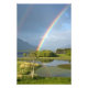 A genuine Irish double rainbow is reflected in the waters of Lough Leane, Killarney, Ireland, with the misty Kerry mountains in the background. Green bushes, reeds and rushes surround the lake shore.