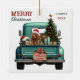 A teal blue retro pickup truck carries a decorated Holiday tree and gift packages on this cute ceramic Christmas ornament. Looking out from the tailgate is a beautiful Irish Setter dog wearing a red and white Santa Claus hat. A rustic wooden sign on the back bumper says "Christmas Cheer". The red and green stylised text at the top left says "MERRY CHRISTMAS", with your name (or your dog's) and the year at the right. Both sides have the same image.