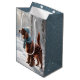 An Irish Setter dog with a cosy hat and scarf stands in a snowy forest with snowflakes overlay.