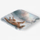 A joyful Irish setter rolls playfully in the snow, its fur catching the light against a dramatic winter sky in a watercolor effect